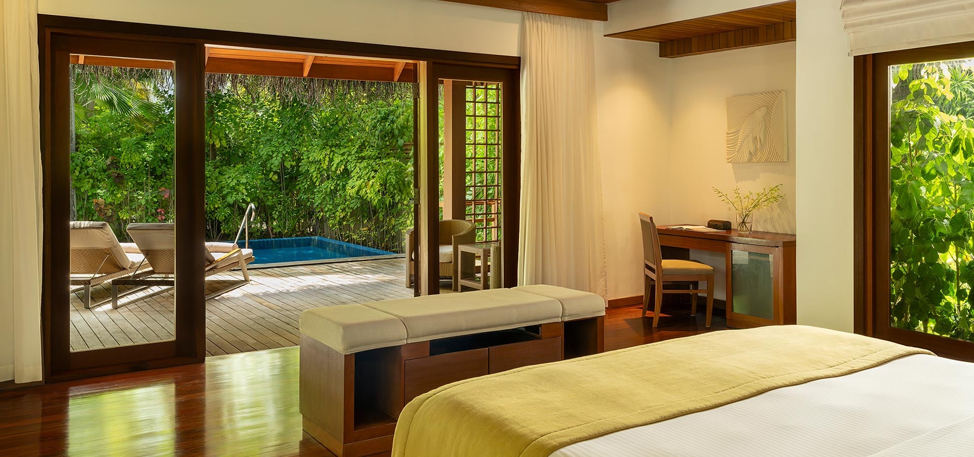A private beach garden, a shaded pool beneath tropical trees – Baros Pool Villas provide peaceful repose within steps of the lagoon. On your deck you’ve got a canopied daybed and sun loungers, where days can be spent bathed in ocean views. White sands, turquoise waters and the wonders of the house reef are just metres away. Inside, spaces that envelope with effortless charm – a comfortable bed, rich wooden furnishings and bespoke Baros amenities await you at one of the finest resorts in Maldives with a private pool.